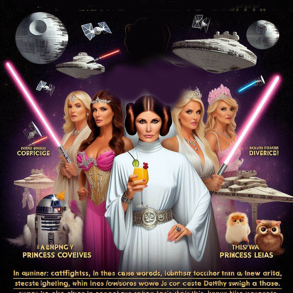 "Star Housewives: The Drama Awakens" brings the glamour and intrigue of intergalactic high society to the forefront. Princess Leia is the reigning queen of the Core Worlds Housewives, but her position is threatened by the new queen bee, Darth Divorcée. Expect lightsaber catfights, Death Star cocktail parties, and enough drama to fill a black hole. With plot twists tighter than a corset and a galaxy's worth of juicy secrets, this is Star Wars as you've never seen it before.
